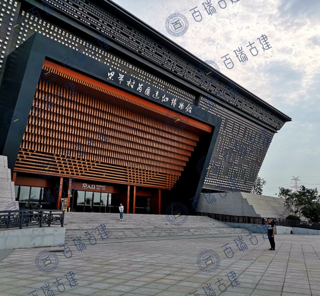 梁带村芮国遗址为两周之际古芮国遗址,博物馆依托遗址保护区而建。博物馆主题建筑以梁代村出土文物镂空方盒简化提炼,融合现代化元素,应用深灰色仿古金属瓦,庄严凝重,气势恢弘,是一座传统与现代相结合的大型博物馆。