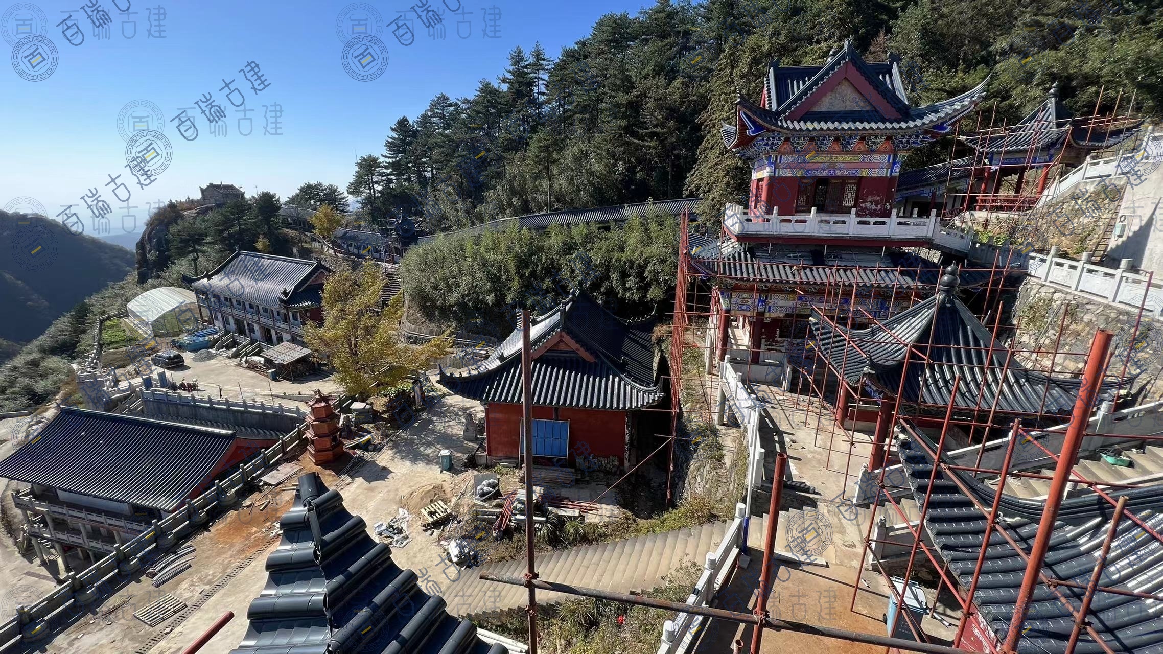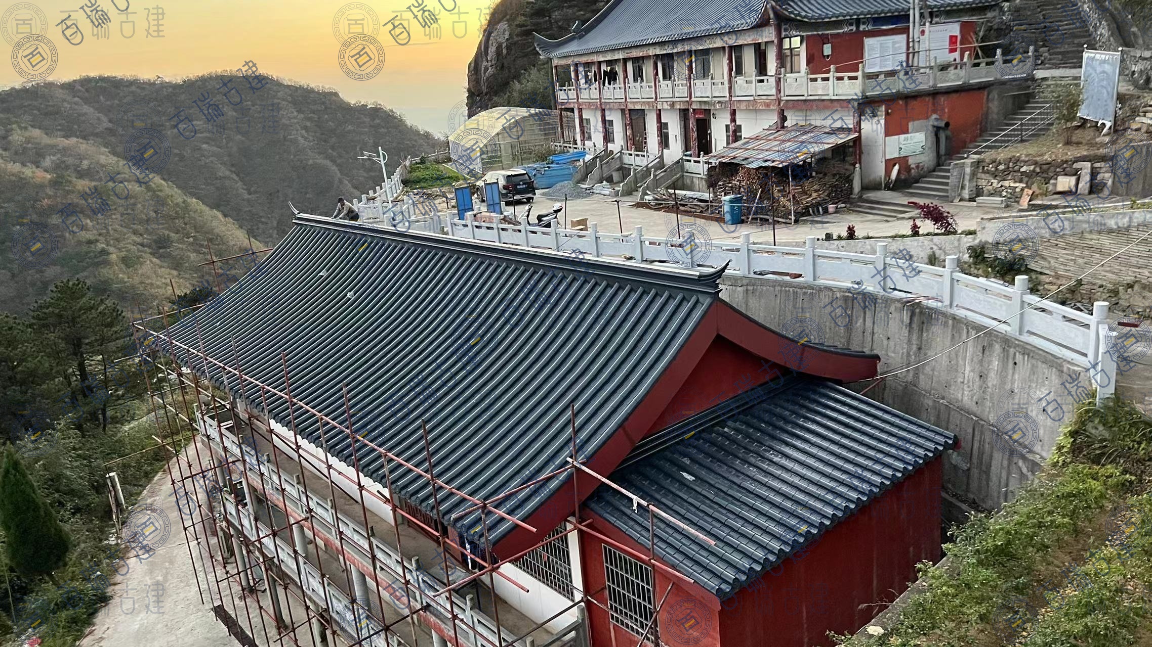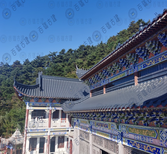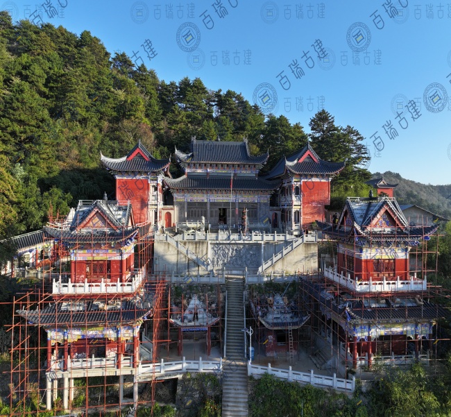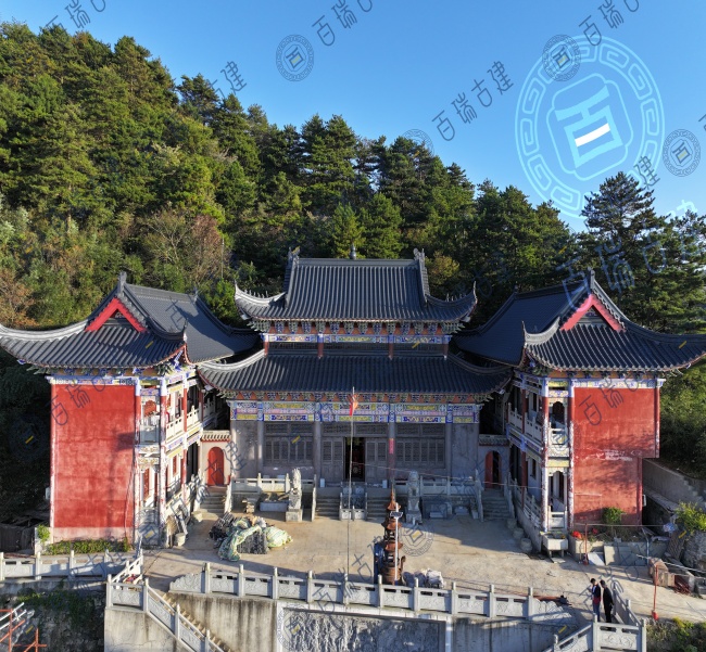 仙人台白云观位于湖北省黄冈市蕲春县,是鄂东一个重要的道教圣地和旅游风景区。“远上寒山石径斜,白云生处有人家”。仙人台巅,峰高鹤深,茂林修竹。极目千里,深灰色金属屋面拼接紧密,较大的坡度使得屋面在视觉上更具层次感和立体感,与周围的山体环境相呼应,形成一种和谐的美感。