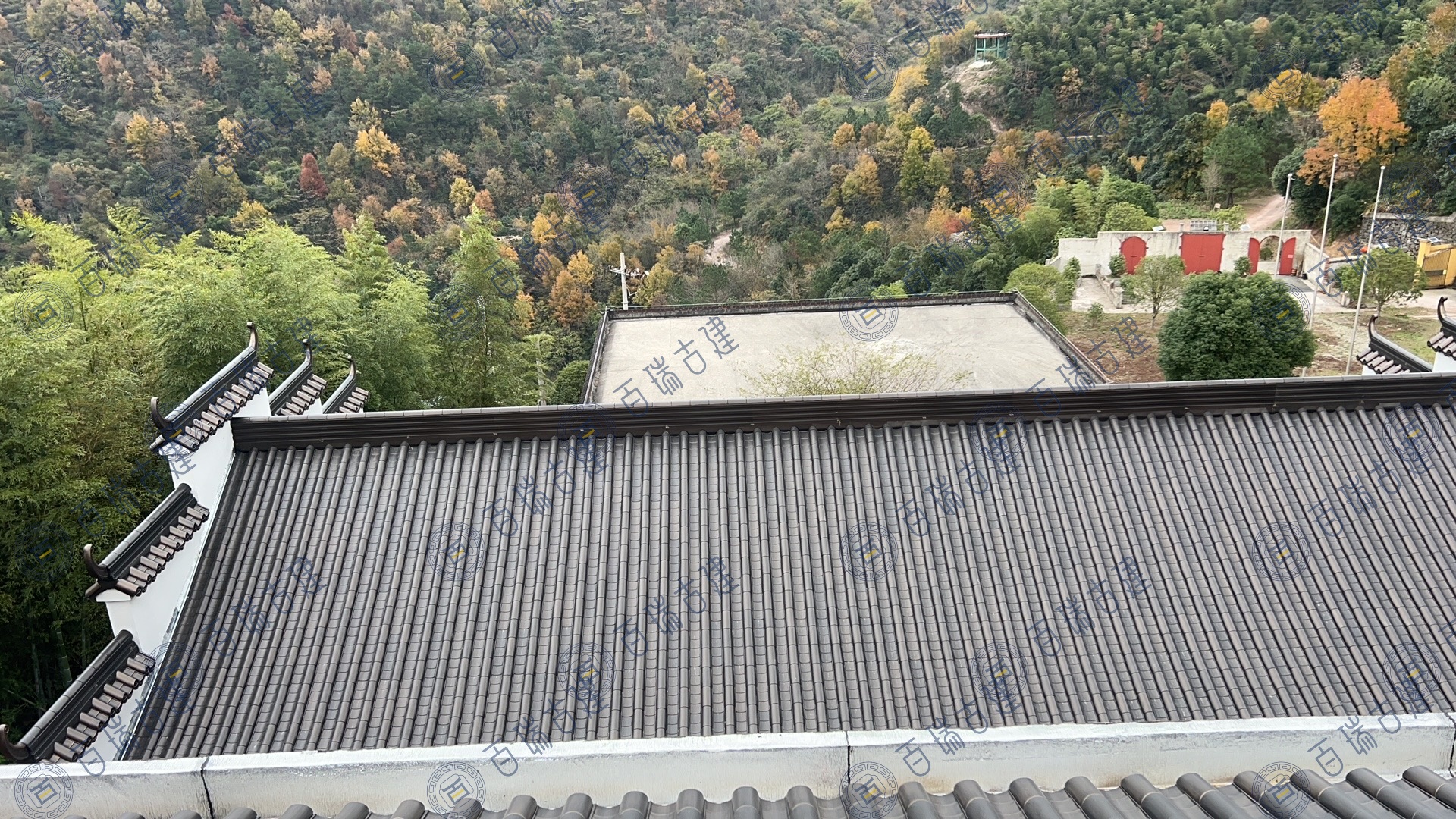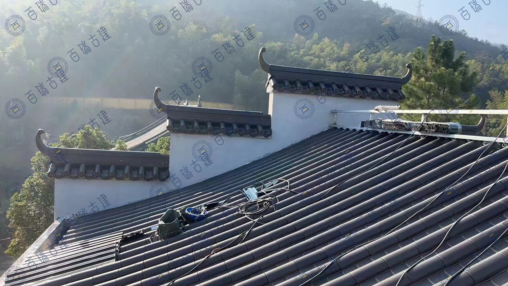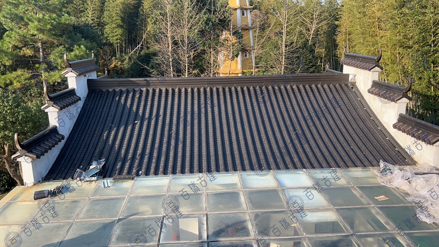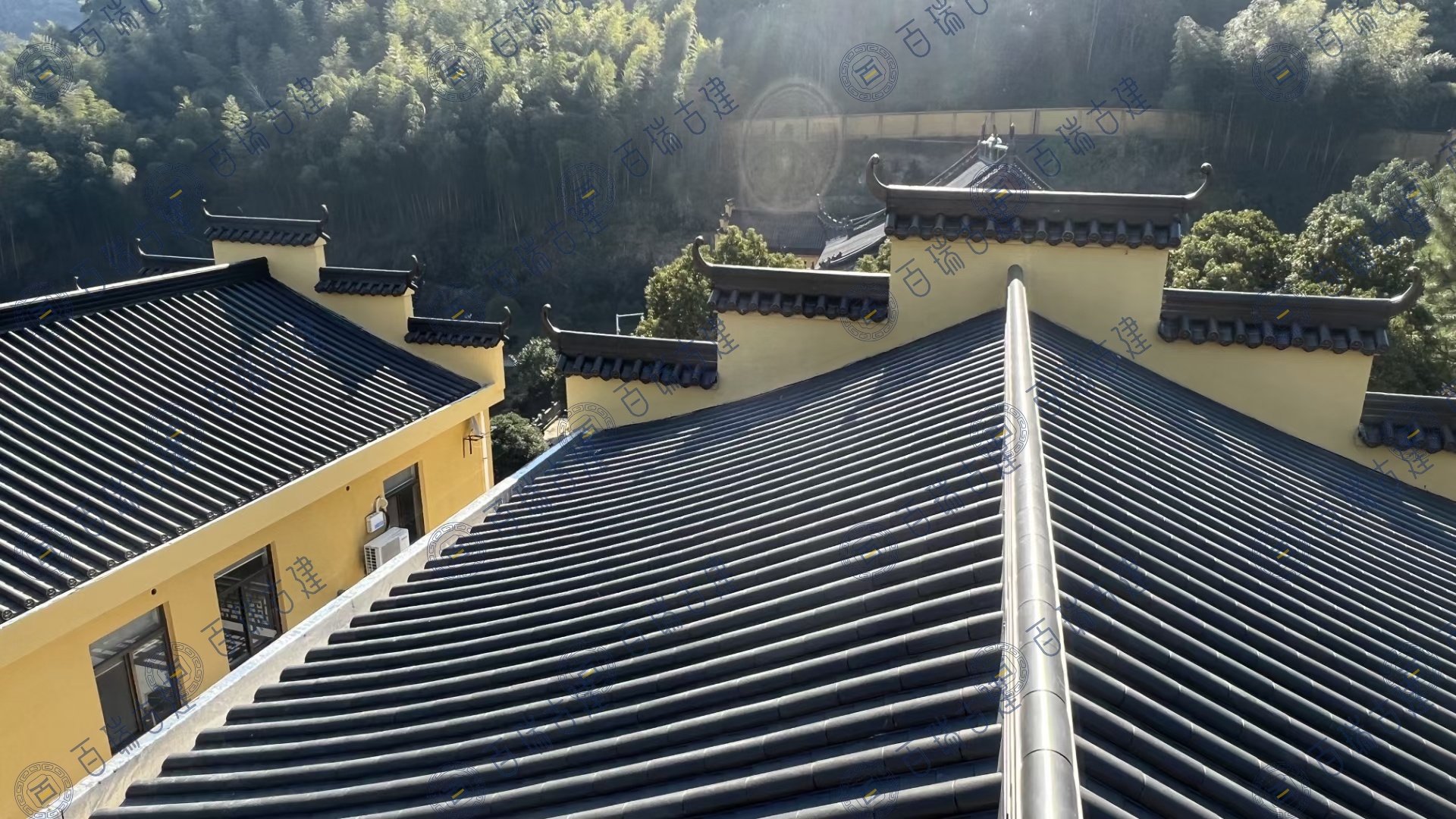 宁波月涛寺位于亭溪岭古道上,原寺庙屋面采用的陶瓦老化、腐蚀情况严重。此次翻新选择的是百瑞古瓦的不锈钢金属瓦,不同于传统瓦片的古朴厚重,不锈钢金属瓦以其轻盈而坚韧的质感,展现出一种别样的现代工业美学。它们整齐地排列在寺庙的屋顶之上,在阳光的照耀下,反射出耀眼的光芒,在群山绿荫之间相互呼应,它优雅庄重又充满自然情趣,意境深远。