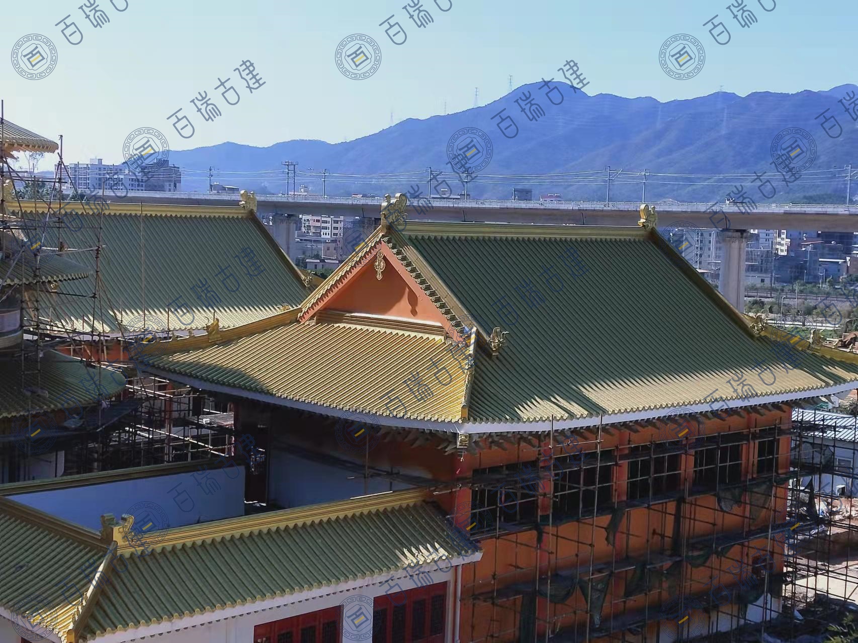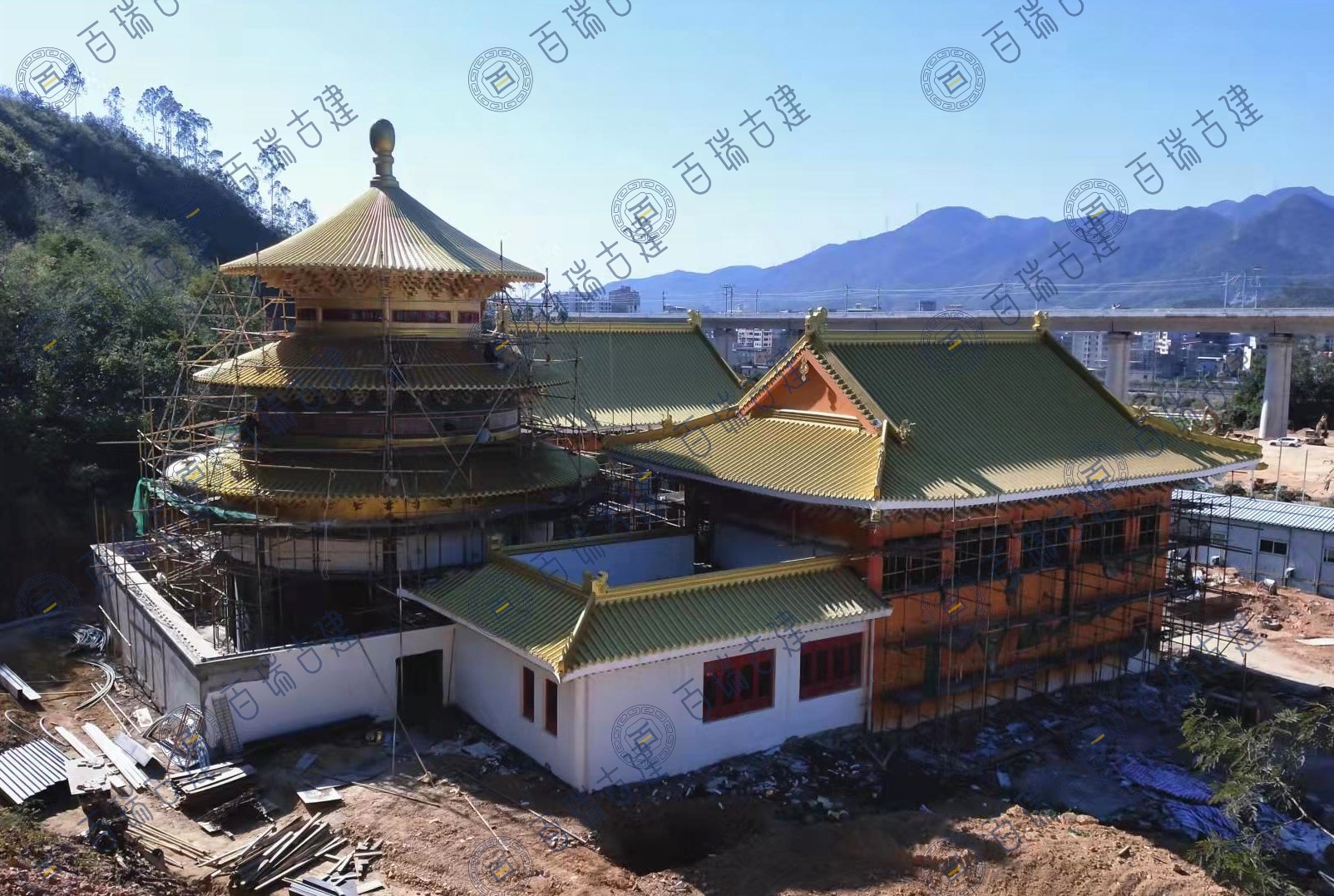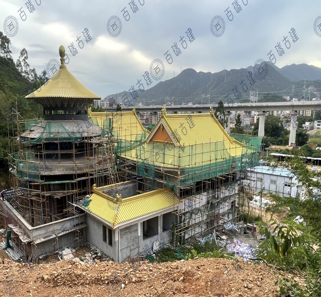 智明禅院位于广东惠州,建筑主体为钢结构,屋面采用珠光金色铝合金金属屋面。圆通殿采用三重檐圆形攒尖顶形式,顶面覆盖筒瓦,中立圆形宝顶,三重檐由下至上层层缩小,非常规整。