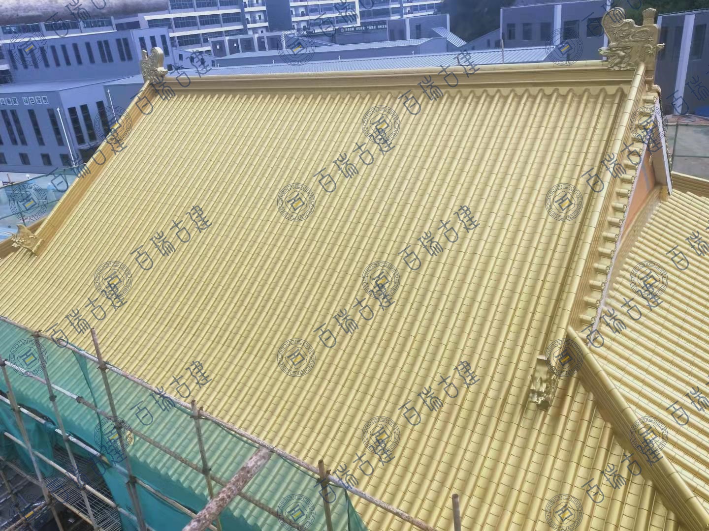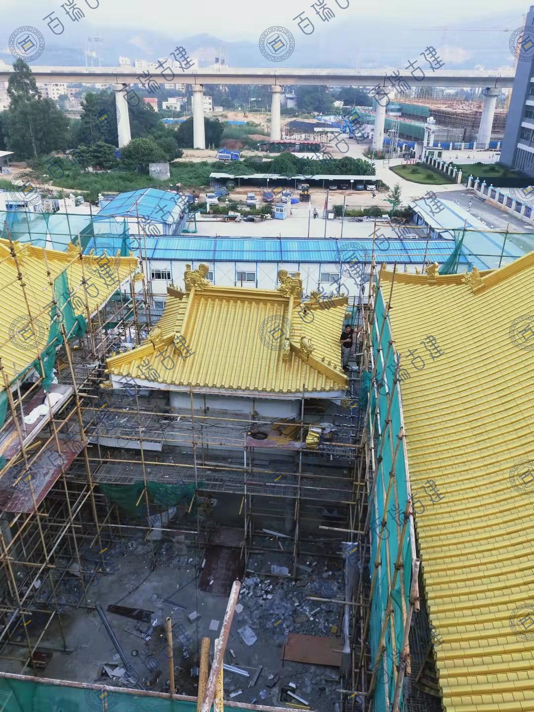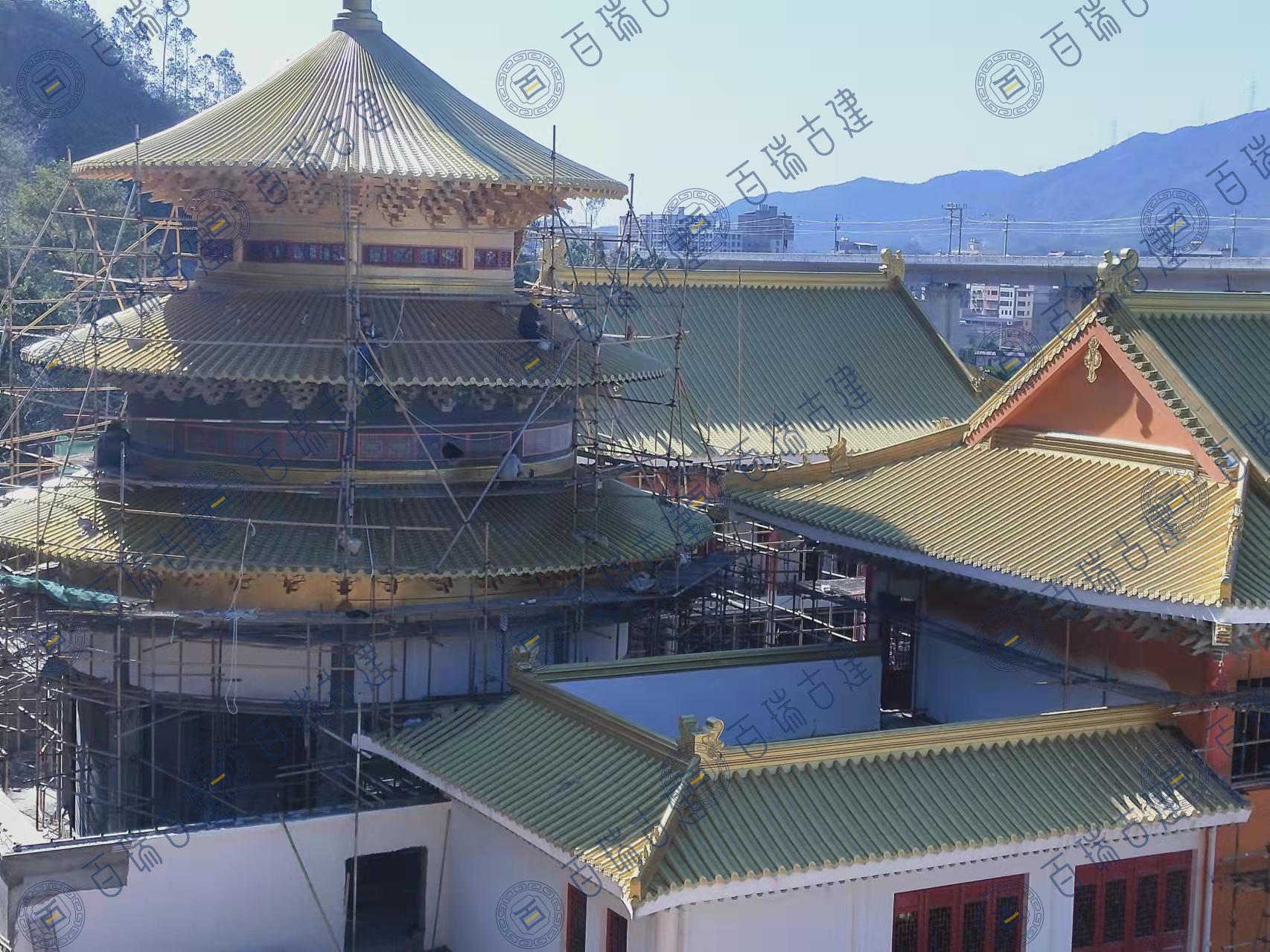 智明禅院位于广东惠州,建筑主体为钢结构,屋面采用珠光金色铝合金金属屋面。圆通殿采用三重檐圆形攒尖顶形式,顶面覆盖筒瓦,中立圆形宝顶,三重檐由下至上层层缩小,非常规整。