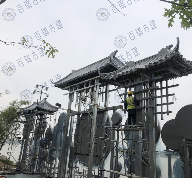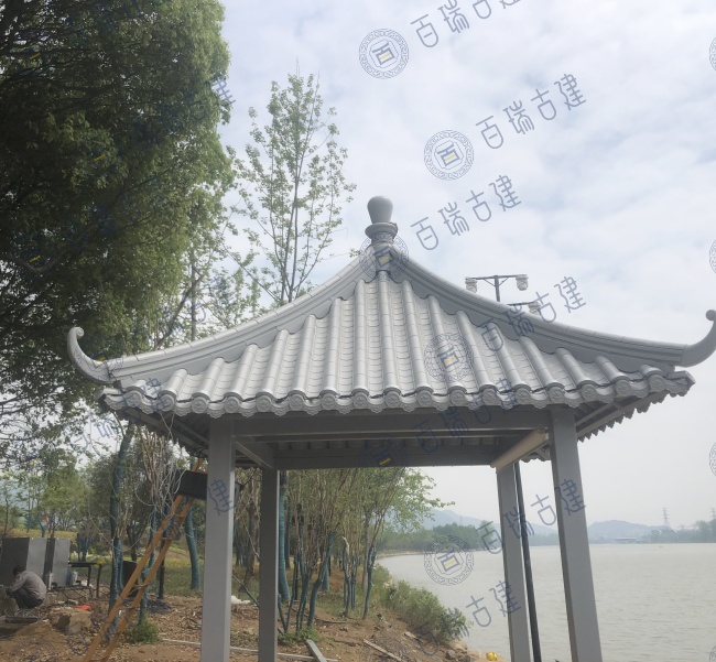 浅灰色的园林装饰建筑静静矗立在富春江畔,观水波荡漾,赏无边江景,享灵动的江南韵味。