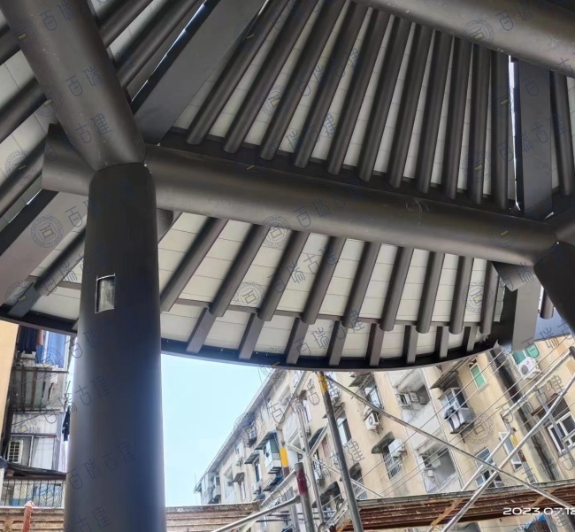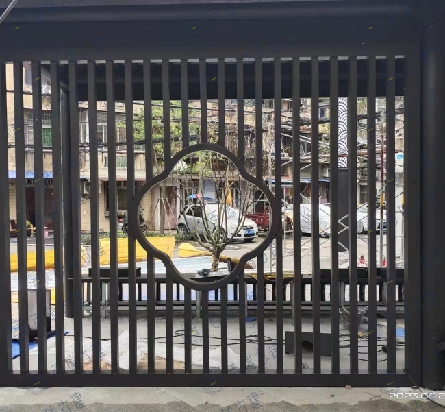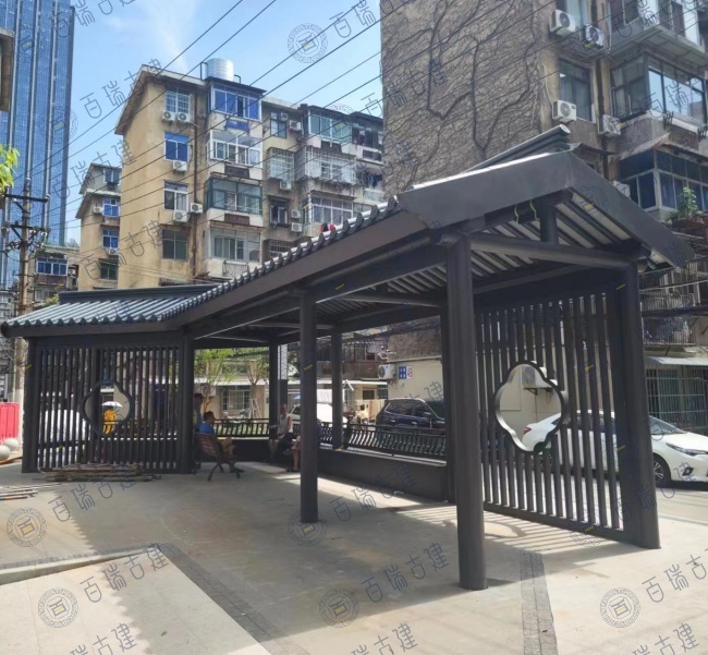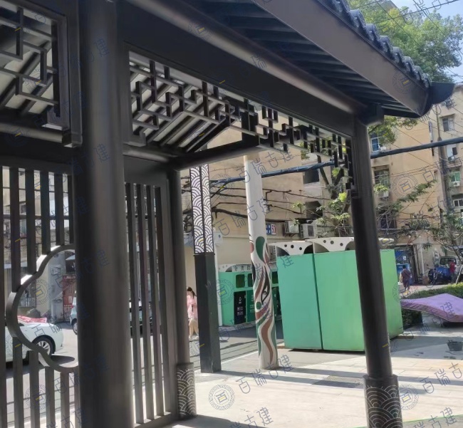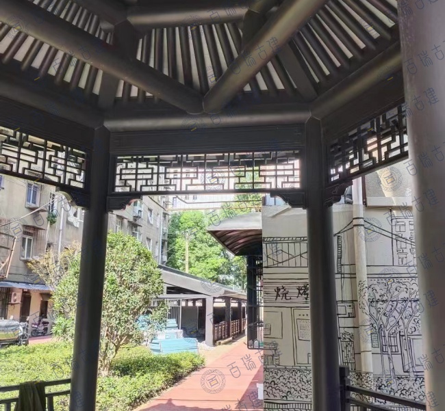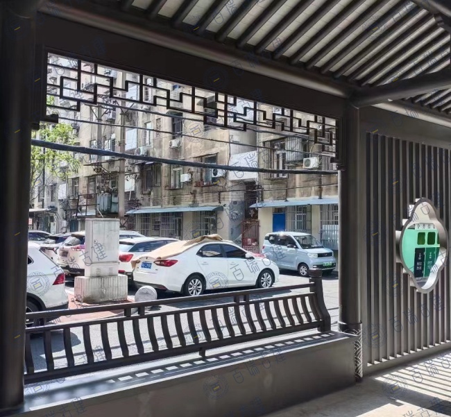 镂空墙融于园景,将社区原有的栏杆式围墙拆除,改建成园林长廊,采用中国传统园林表现手法,通过镂空花窗借景,打造江南园林风格。增建一座中式风格的凉亭,亭内设有座椅供市民休憩。无界廊架,棕色的廊架状如丝带,高低起伏。