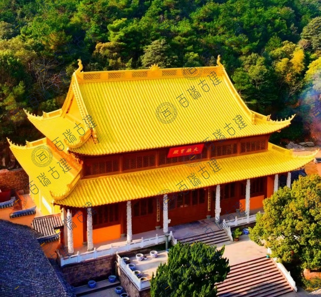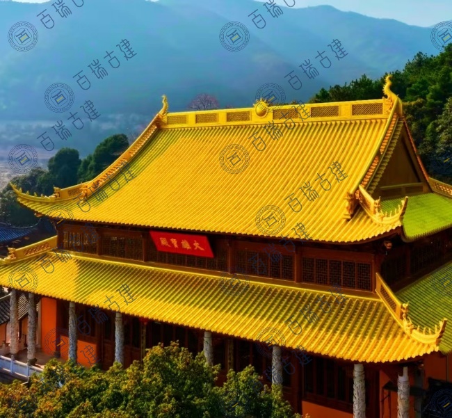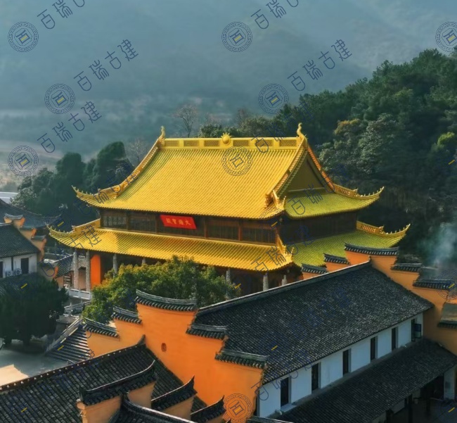 弥陀净寺位于浙江象山白沙湾,寺院依山面海,环境优美。在古朴的灰瓦之间,金色的金属瓦宛如一颗独特的星辰,以其别具一格的金属风格中和自然的暖色调,自然的生机又为金属建筑注入了活力,仿佛在诠释人与自然、佛与众生的和谐共融。