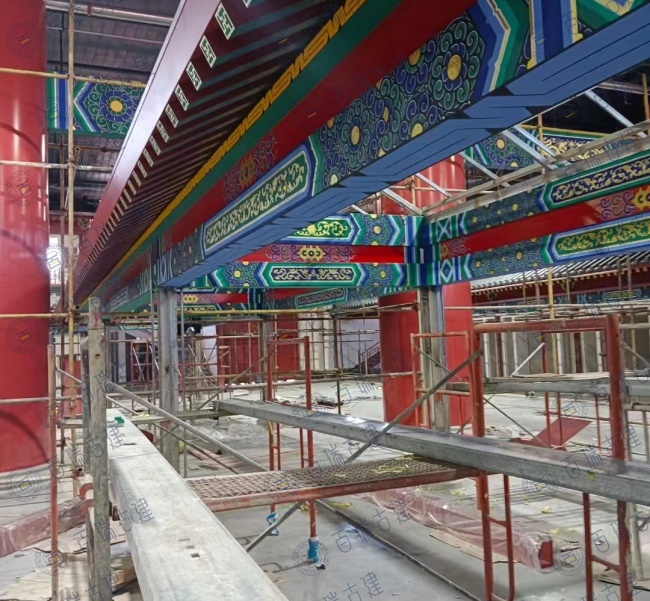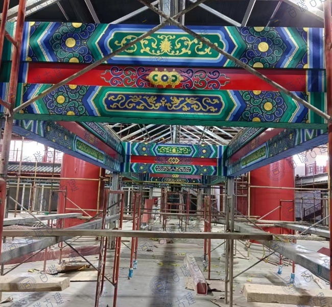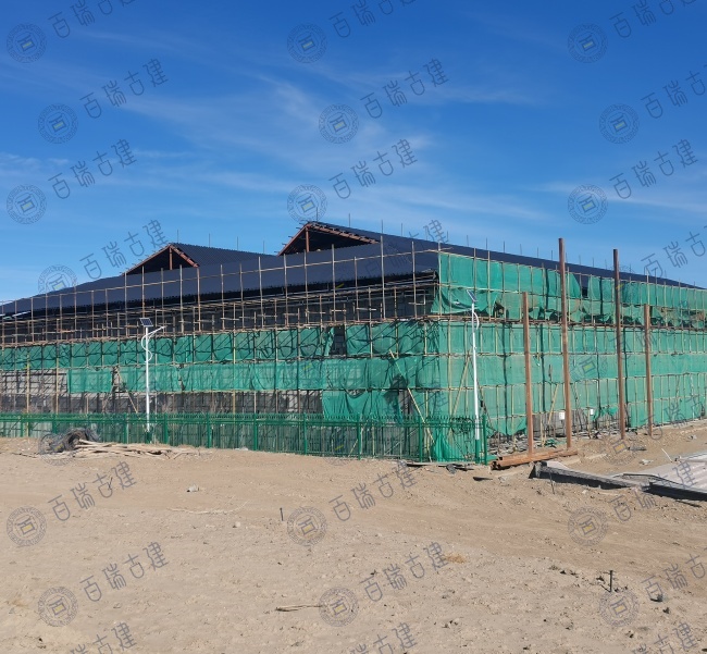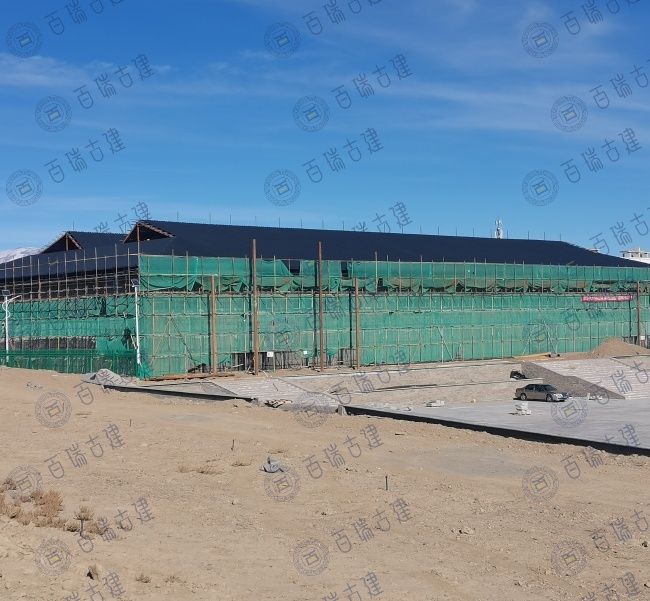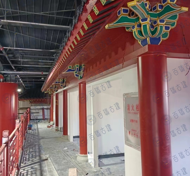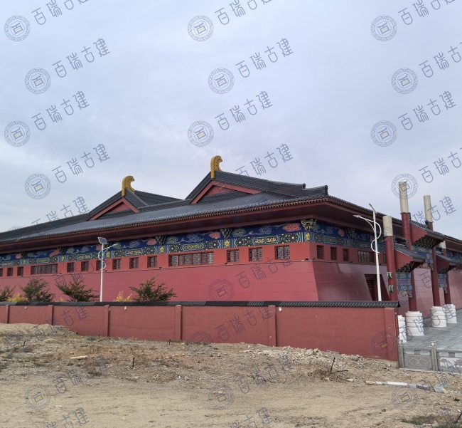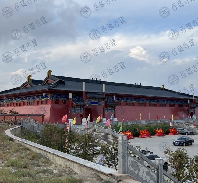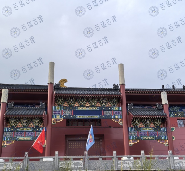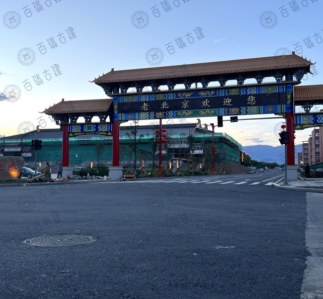 老北京美食广场位于新疆和布克赛尔蒙古自治县,广场带有浓浓的老北京味道。红墙作为建筑的主体背景,庄重而威严,屋面覆盖层层叠叠的灰瓦,与红墙形成鲜明的色彩对比。而檐下的彩绘则是画龙点睛之笔,在红墙灰瓦之间闪耀夺目