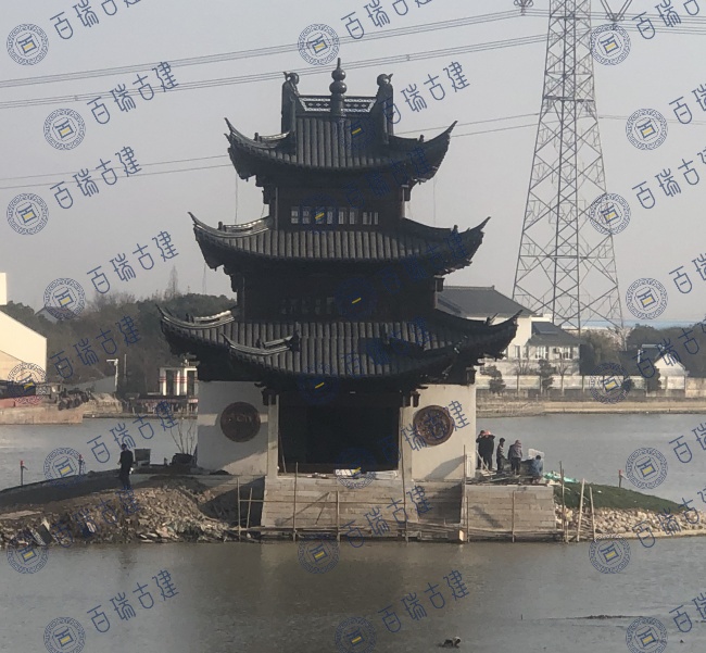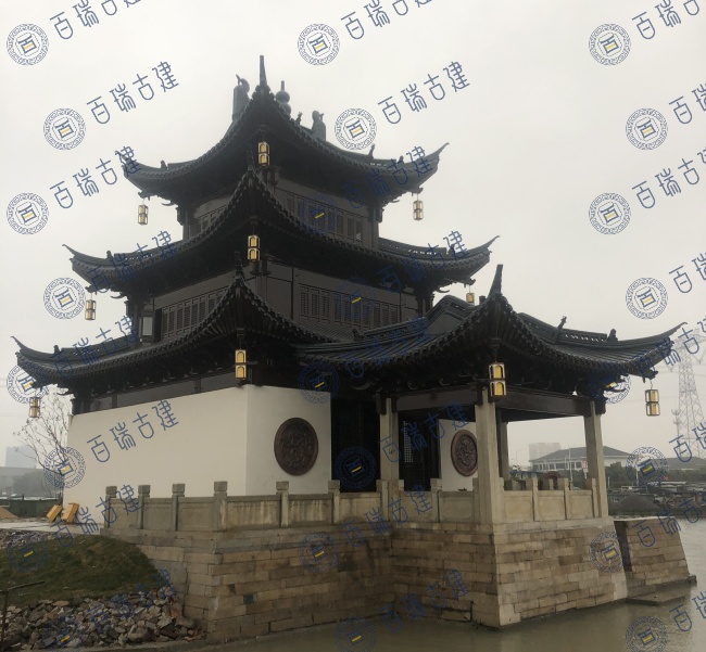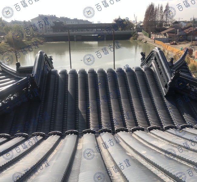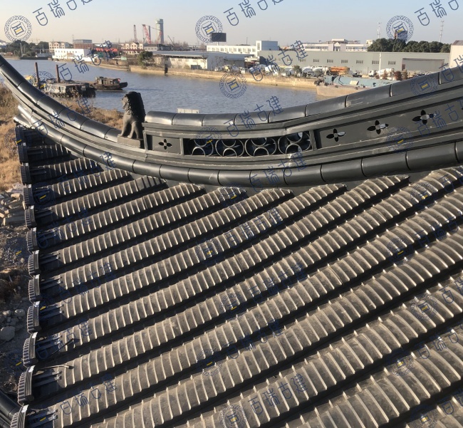 南浔古镇位于浙江湖州,是一个历史悠久的水乡古镇。此次屋面采用深灰色小青瓦,典型的江南水乡风格,还有别致的飞檐翘角,青瓦白墙、浮雕,周围环绕着河流,展现了古镇的独特魅力。