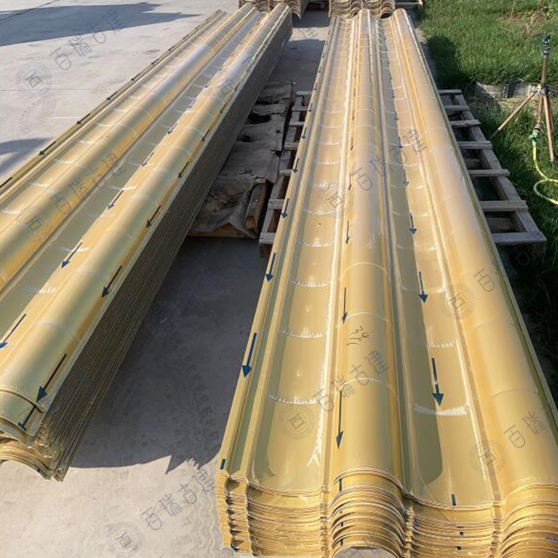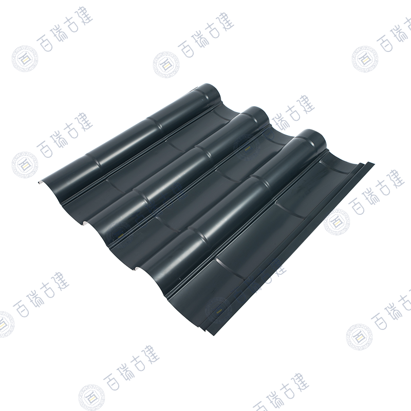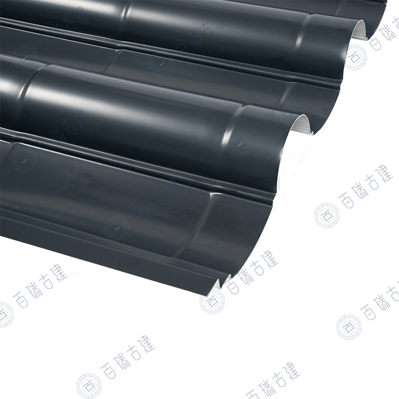 连体仿古铝瓦宽度一般为700mm、780mm,长度可根据建筑屋面具体需求自由裁切。颜色以灰色、金色为主,可按需定制。