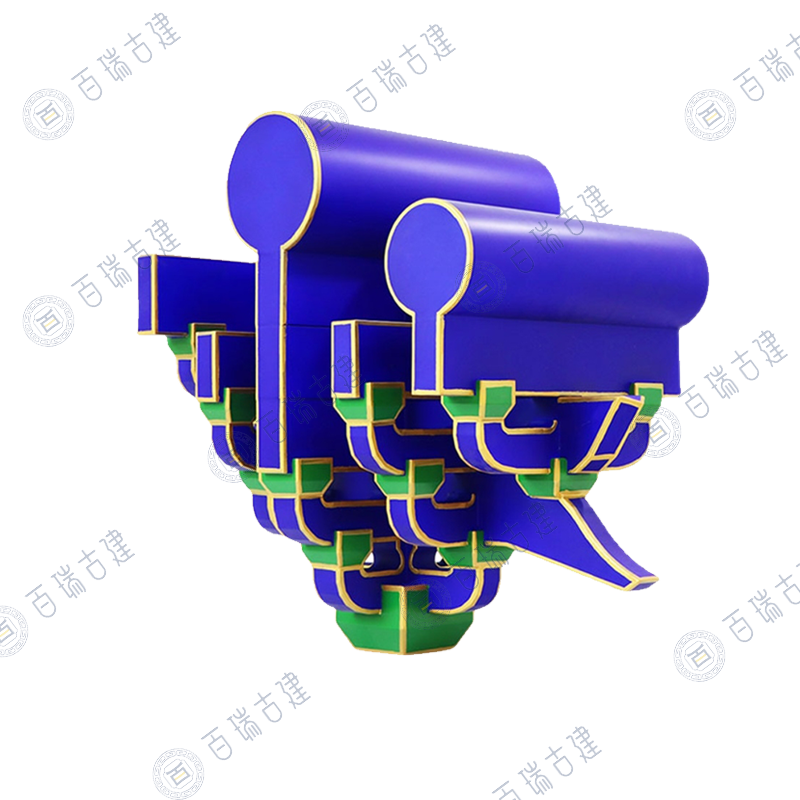 “斗拱”是由若干个栱件层层垒叠,相互搭交而成的组合构件,是一种既具有悬挑作用,又具有装饰效果的支撑性构件。
